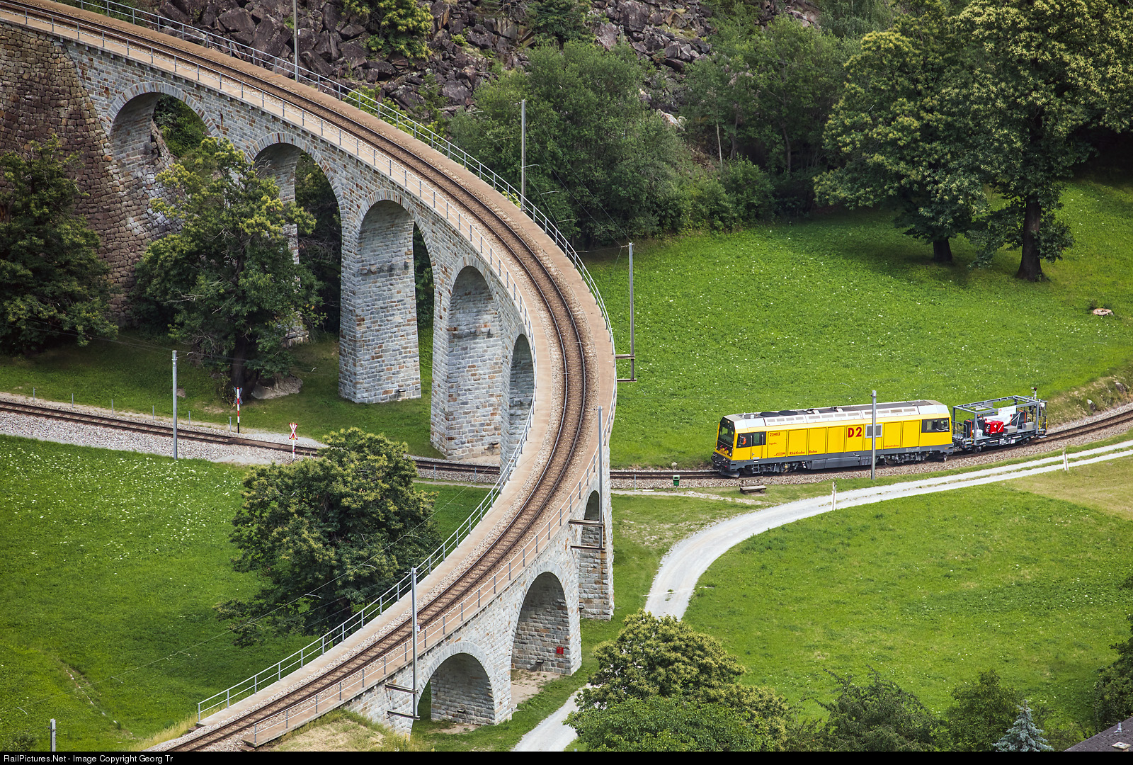 | "Schalke" diesellocomotive Gmf 234 # 02 "Engiadin" is running through the famous Brusio spiral viaduct, pulling the new rail corridor dyagnosis car P # 10175 of the ARGE Sersa/INovitas/Kistler (former ciment silo car "Mohrenkopf" Uc # 8098, built by Josef Meyer/MBA in 1964, sold to Sersa in 2014). The car is used on the entire RhB network and the lines are recorded with high-resolution, georeferenced 3D video (infra3DRail of INovitas). |