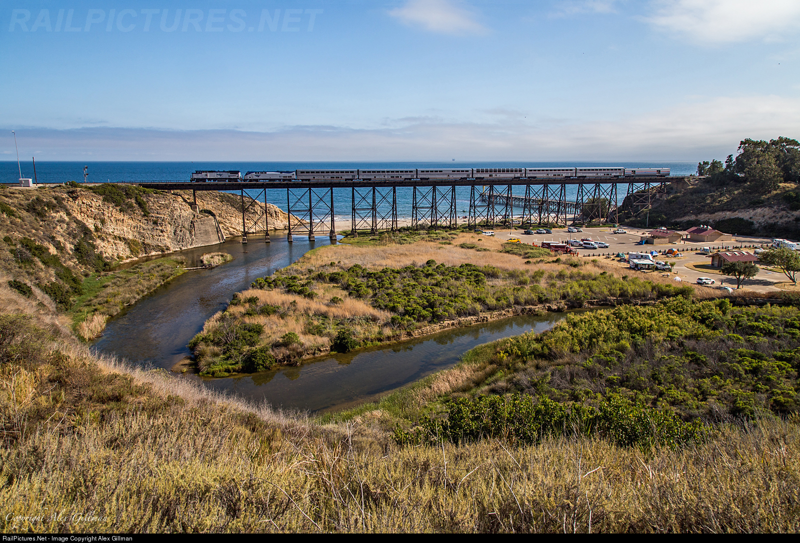 Making good time on its southern trip down the rails that the famous Daylight passenger train once plied, Amtrak's southbound Coast Starlight races across the 811-foot-long Gaviota trestle. Today's train No. 11 is led by a veteran Dash-8BWH locomotive, the AMTK 510, that was delivered to Amtrak in December of 1991. With almost 30 years of service under its belt, this unit is no stranger to the coast line and still looks sharp on the point of a long distance passenger train.