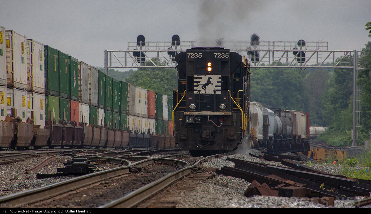 A pair of SD70ACu locomotives, both facing east, shove hard on 12G as the finish their uphill battle over the west slope. The full interlocking of "CP-MO" is in view, showing off the new 5 track signal bridge guarding the east end of the interlocking. Long trains, SD70ACu helpers, and new signals are the new norm on NS's Pittsburgh Line.