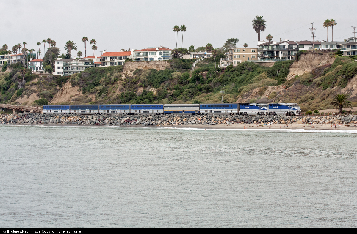 | A view into the recent past when F59PHI's still roamed the surfline. On this warm July day, double headed 464 and 457 make their way past San Clemente Pier heading towards San Diego as beachgoers enjoy the waves. |