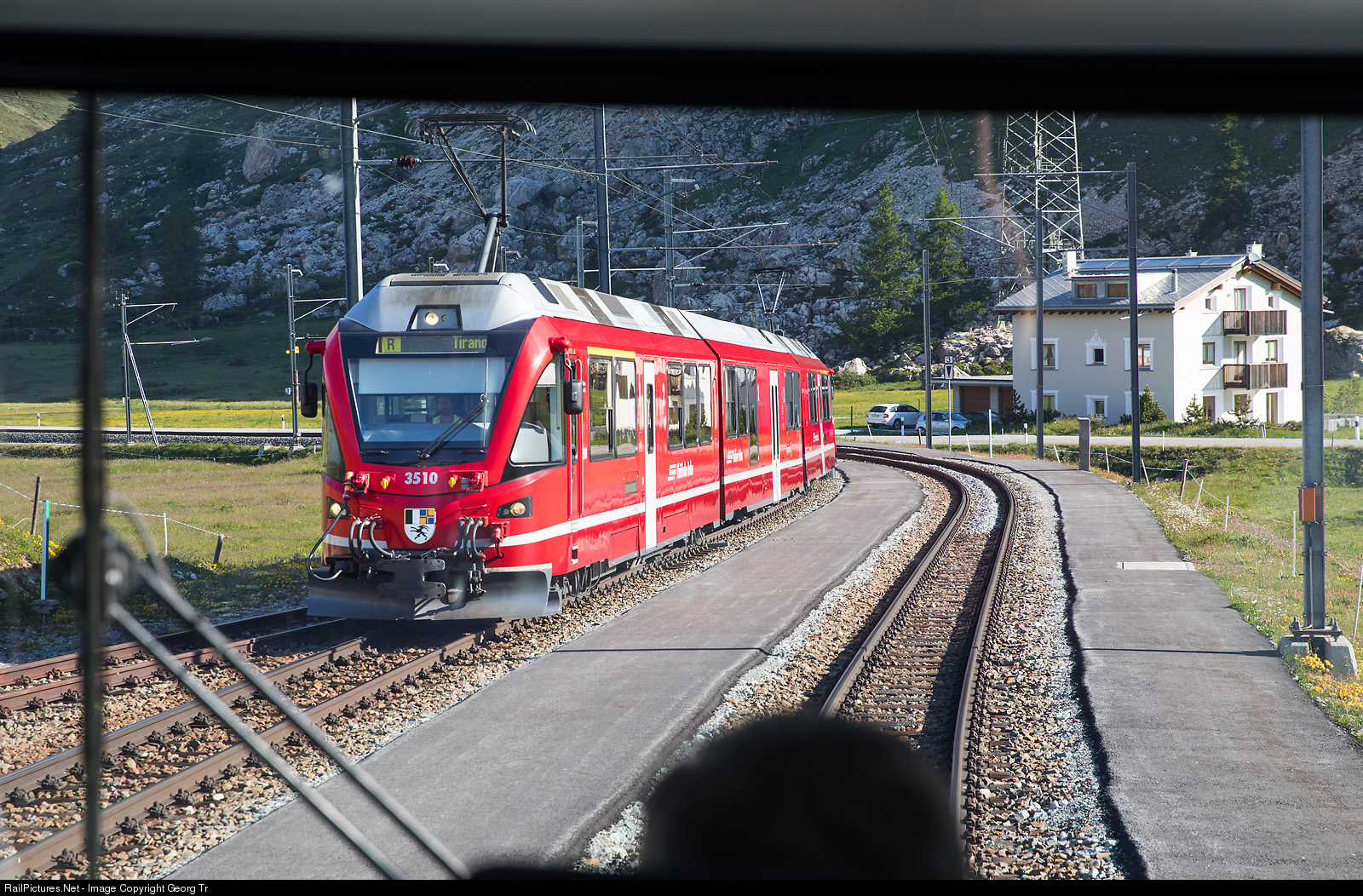 | Crossing in Bernina Lagalb station, seen from the first class compartment of the "Allegra" ABe 8/12 # 3505 of train 4628, through the window behind the cab "over the shoulder" of the engineer. ABe 8/12 # 3510 is entering the station with train R 4613 from St.Moritz to Tirano. |
