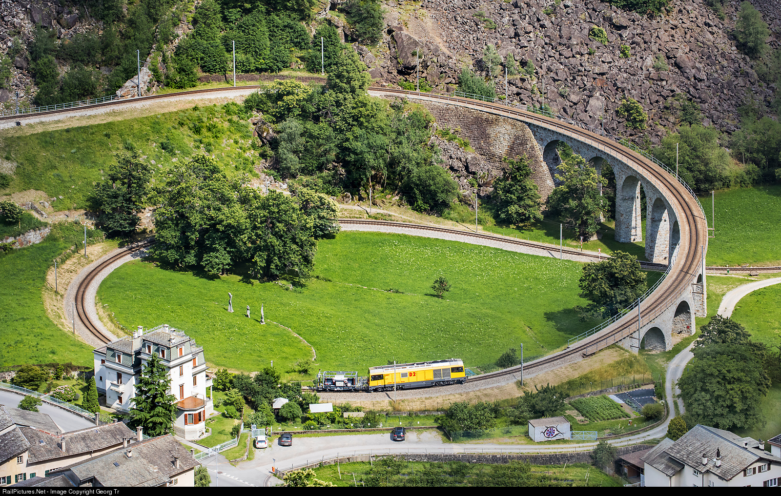 "Schalke" diesellocomotive Gmf 234 # 02 "Engadin" of the Rhaetian Railway is rounding the 70 meter radius curve of the Brusio spiral viaduct, which is in a grade of 7.0 % and was built in 1908 for the Bernina Railway. The viaduct has 9 bows of 10 meter span each, the height is between 7 and 17 meter. The locomotive is running as train 9636 from Tirano over the Bernina pass to Samedan, pulling the rail corridor dyagnosis car P # 10175 of the ARGE (syndicate) Sersa/INovitas/Kistler, which is recording the line with highresolution, georeferenced 3D-Video of the "infra3DRail" system of INovitas.