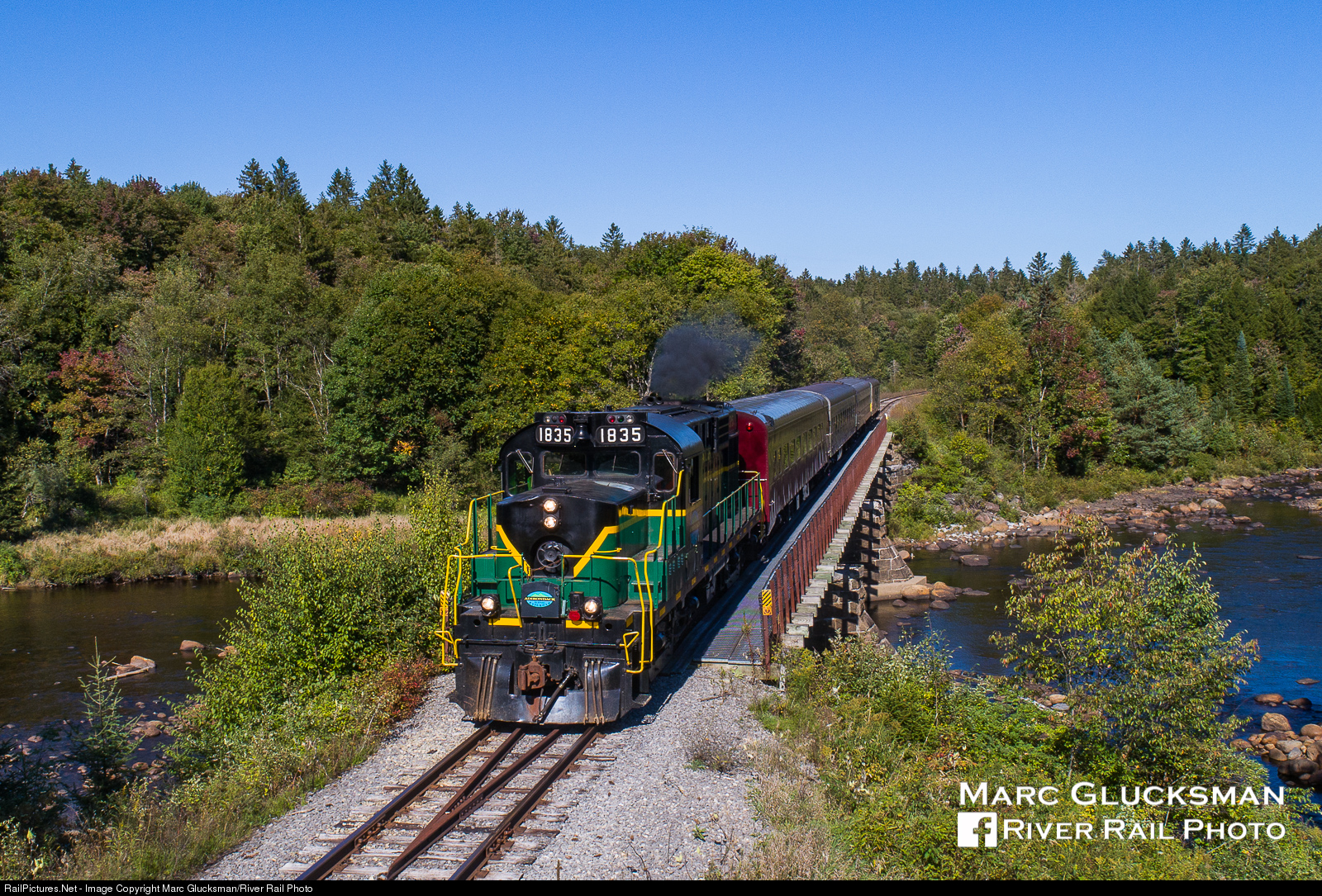 | Notchin' up. On the afternoon of Sunday, September 23, 2018, Adirondack Scenic Railway 1835 (RS18u, neƩ-CP 8780, RS18, 5/1958), heads back to Utica, NY with a trainload of travelers. The MLW puts out a nice head of smoke as it hauls four cars across the Moose River on the former New York Central Adirondack Branch. Once the route of overnight trains to Lake Placid, it has today become divided as part tourist railroad and part center of controversy over conversion to trails. |