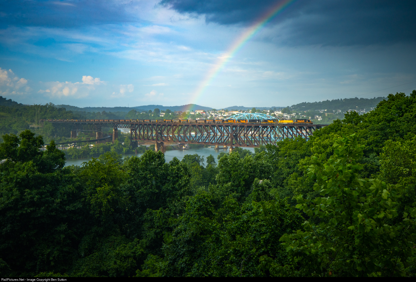 WE 3067 and a variety of other Wheeling power takes a train west across the Speers Trestle just as a rainbow appears across the Mon Valley.