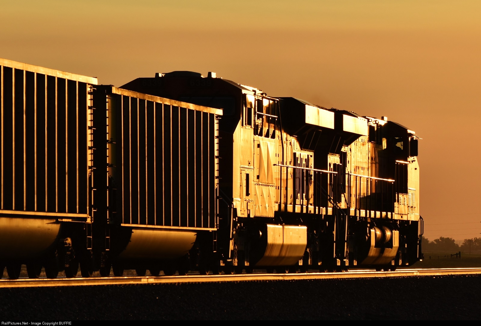 Soon after the California Zephyr past through Wiggins, an eastbound empty coal lead by BNSF 5968 (ES44AC) approached, heading into the orange sunrise.