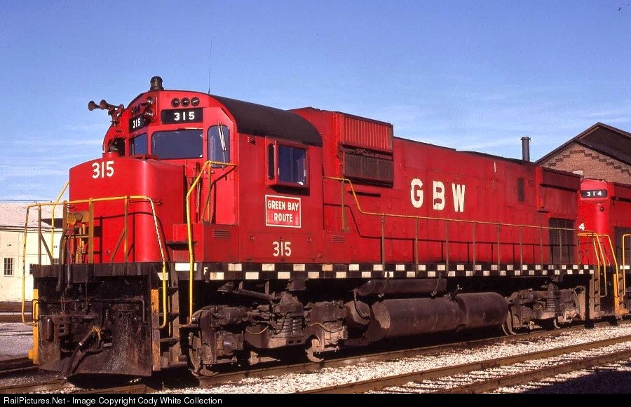 | Green Bay and Western C430 315 resting outside the shop at Norwood Yard in Green Bay June 1978. The 315 was built in February 1968 and served the GBW until suffering a broken crankshaft in 1986. The head and pistons from the 315 were reused in RS11 309 and then the 315 was donated to the National Railway Museum in Green Bay in June 1987. This was the GBW's sole C430 and was built with Alco's Hi-Ad(High Adhesion)trucks. John Swift Photo from my Collection. |