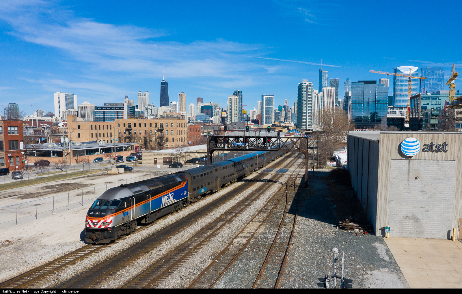 | Metra MP36 417 pulls an outbound commuter train departing Chicago on a Friday evening over the Milwaukee District. The train is passing under the former PRR signal bridge at CP Morgan as it heads west. |