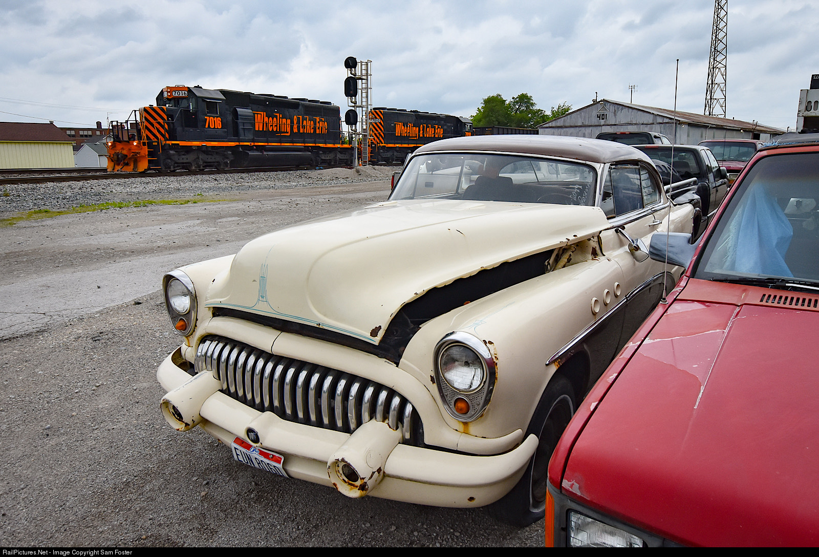WE 7016 passes an old car as it departs Norfolk Southern’s Moorman Yard in Bellevue, Ohio.