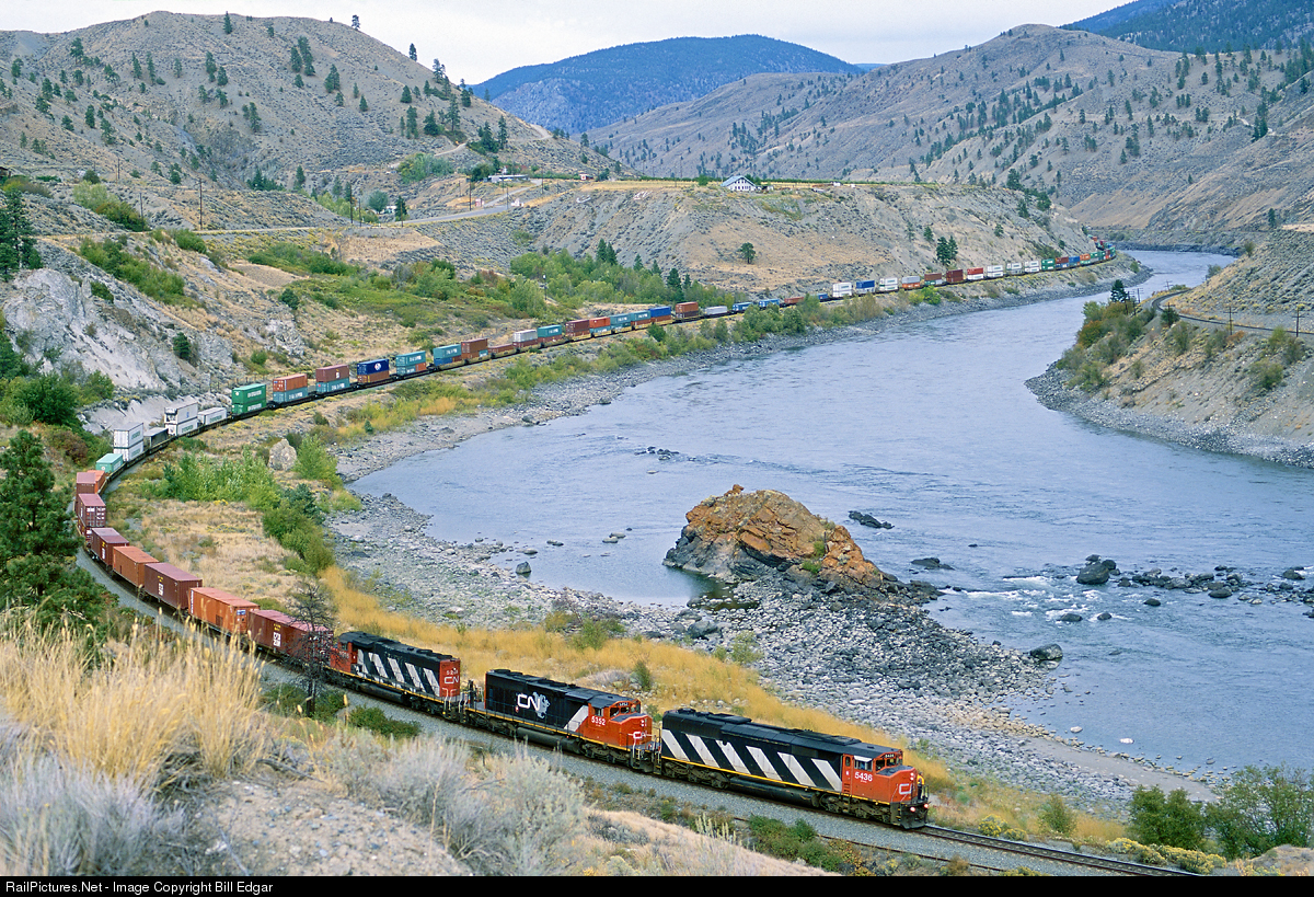CN SD50F 4536 leads a pair of SD40-2Ws, one in the North American paint scheme, on a westbound stack train headed for the Vancouver area. The train is just northeast of Spences Bridge rolling along the Thompson River with CP's mainline viewable on the otherside.