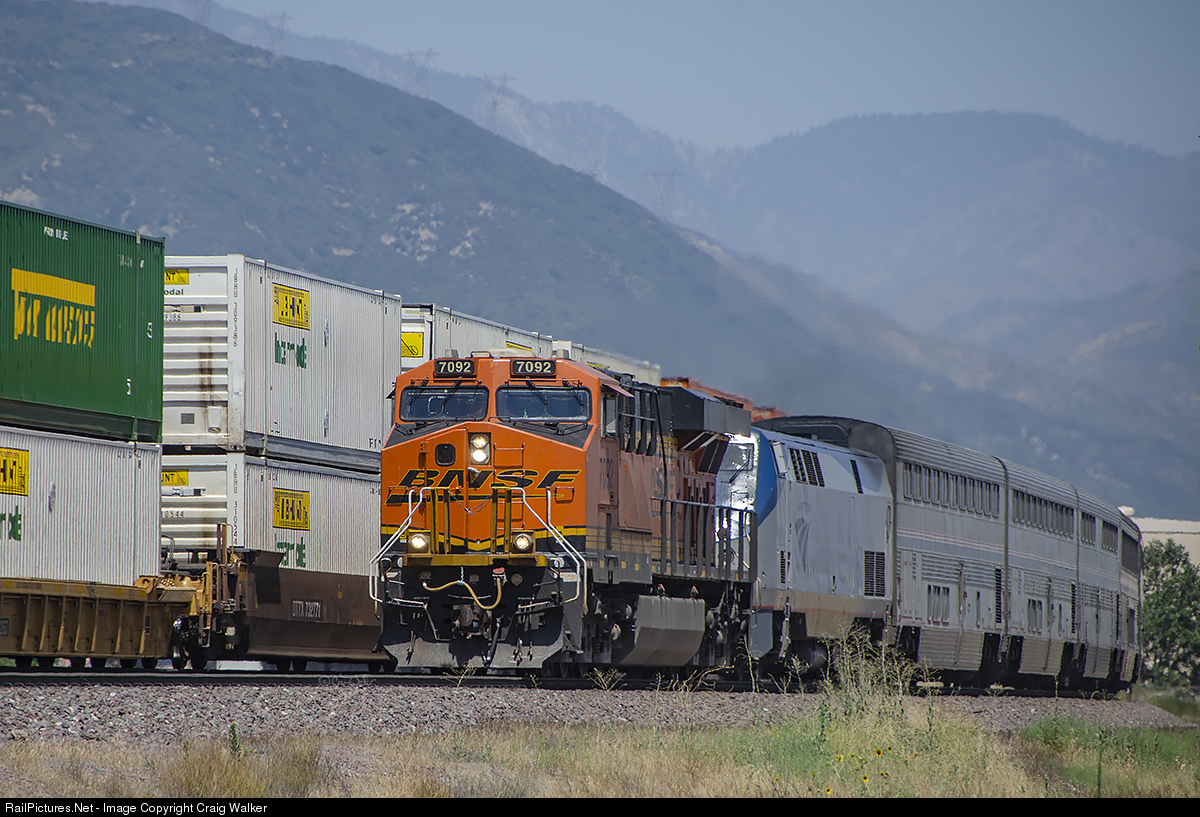 Amtrak train 3, the westbound Southbound Chief, is only five-hours late as it passes through Verdemont, at the base of Cajon Pass. Just ahead is a stop at San Bernardino, which will include a crew change (thanks to being so late) and, after departing, a fifteen-minute stop to get problems with the Positive Train Control fixed. BNSF ES44C4 7092 was added in Gallup NM after number 3’s lead engine, AMTK 41, was removed to assist Amtrak 4 (the eastbound Southbound Chief) when one of its two P42DCs quit running. As a result, number 3’s lone P42DC, number 90, overheated. And so, here the train is, in broad daylight instead of at sunup. (San Bernardino, California – June 27, 2020)