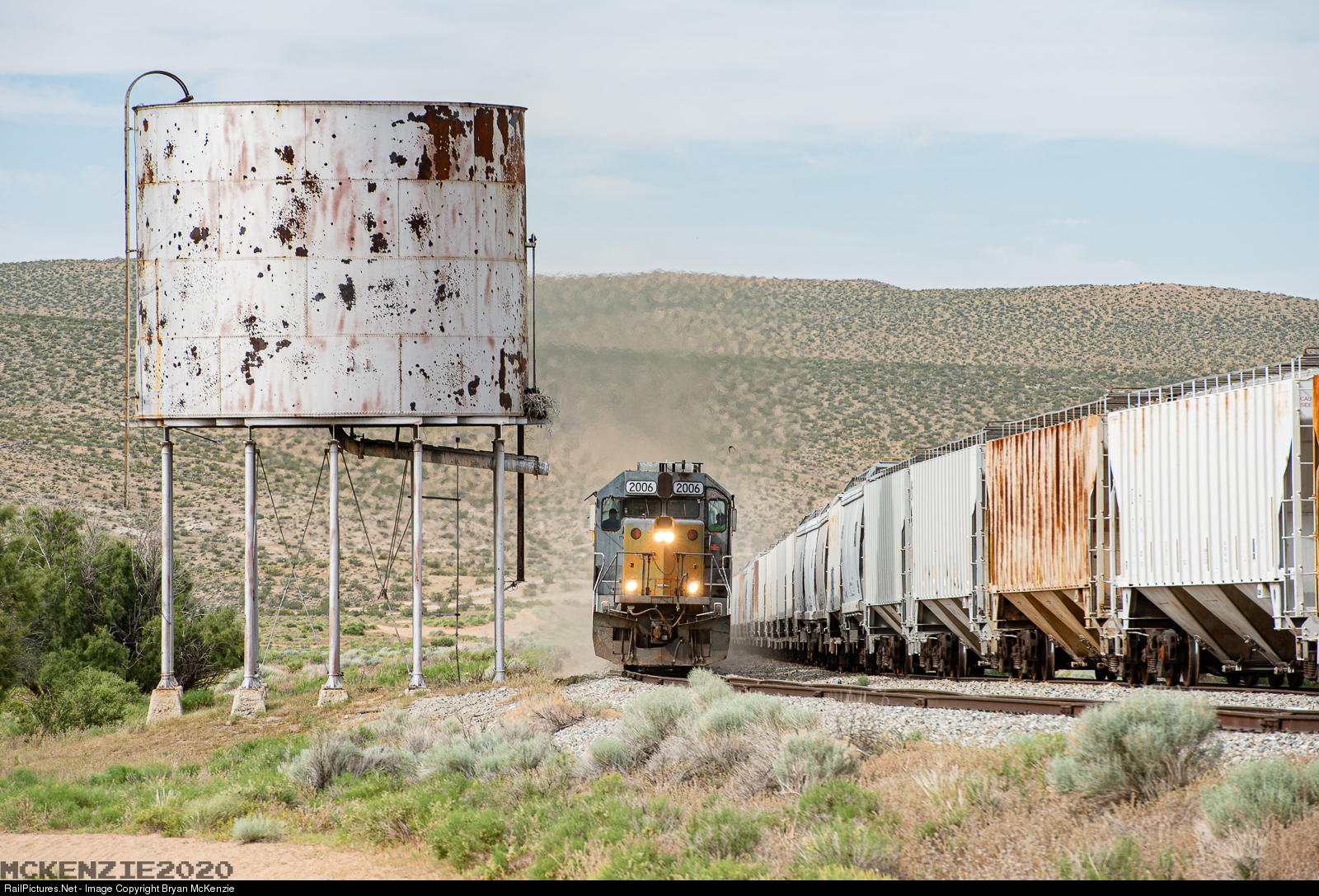 A trio of Trona Railway SD40-2 variants pull hard on a 70 car empty coal train headed to the UP interchange at Searles. The water tower on the left is a relic of the steam era, used during a time when the SP Jawbone Branch saw a variety of steam engines from Mojave CA. Shortly, the engineer will throttle down and hand off the coal train to the UP, which will pull it the rest of the way down the branch to Mojave, CA.