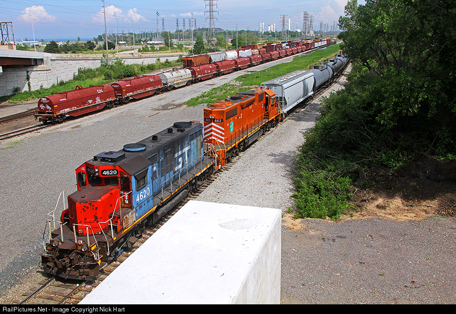 | A pair of classics are in the process of taking headroom out of CN's Kirk Yard. GTW GP9R 4620 and EJ&E SD38-2 663 provide the power as the train approaches the Lakefront Subdivision. 4620 is of Central Vermont heritage and was built in 1957. 663 was built in 1975 and while both units look a little tired, they're still working hard in 2020. |