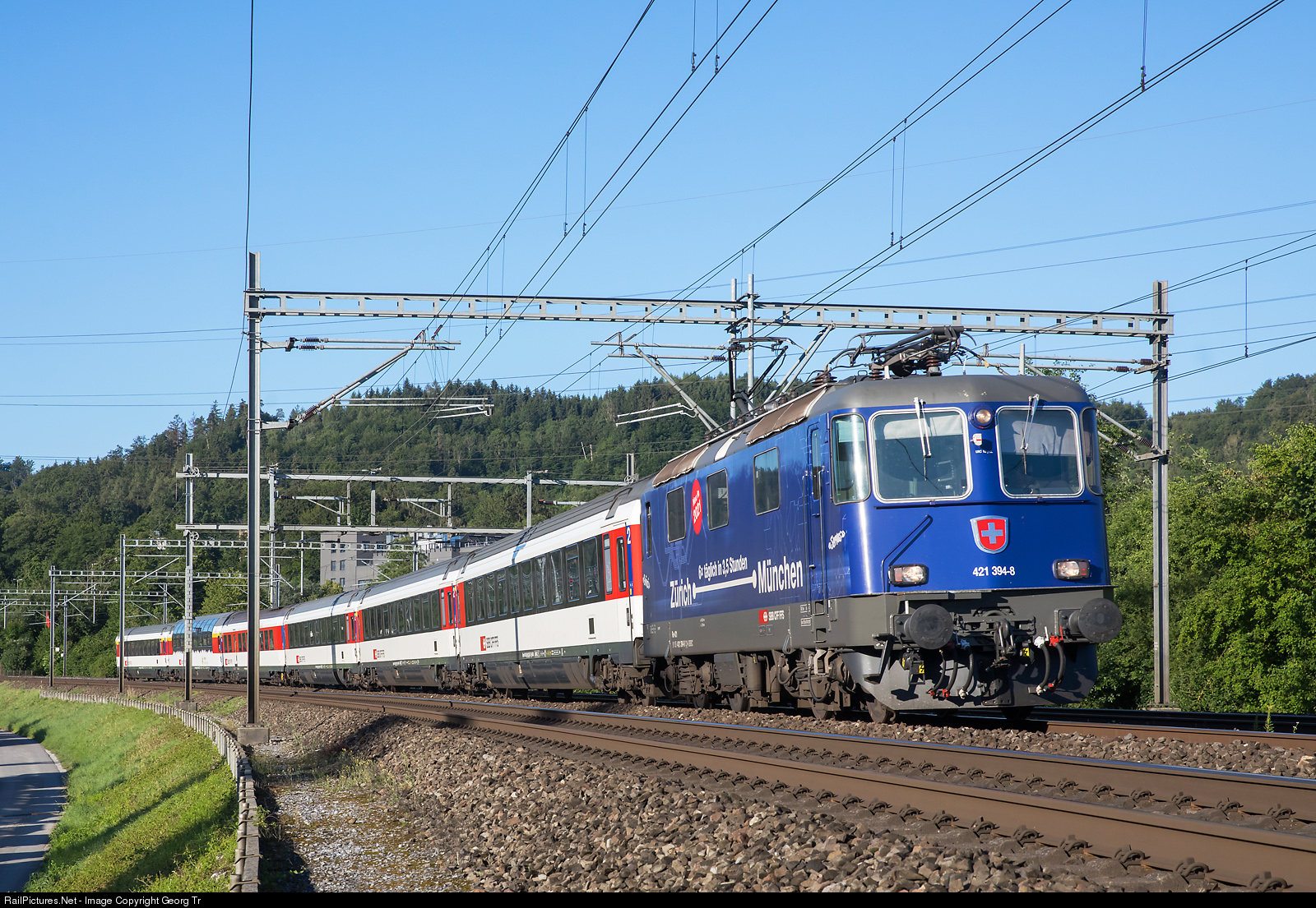 | Re 421 # 394 in the publicity paint scheme for "6 times daily in 3 1/2 hours Zürich-Munich" is pulling the Eurocity 191 from Zürich to Munich near Winterthur. The locomotive is in charge between Zürich and Lindau/Germany. |