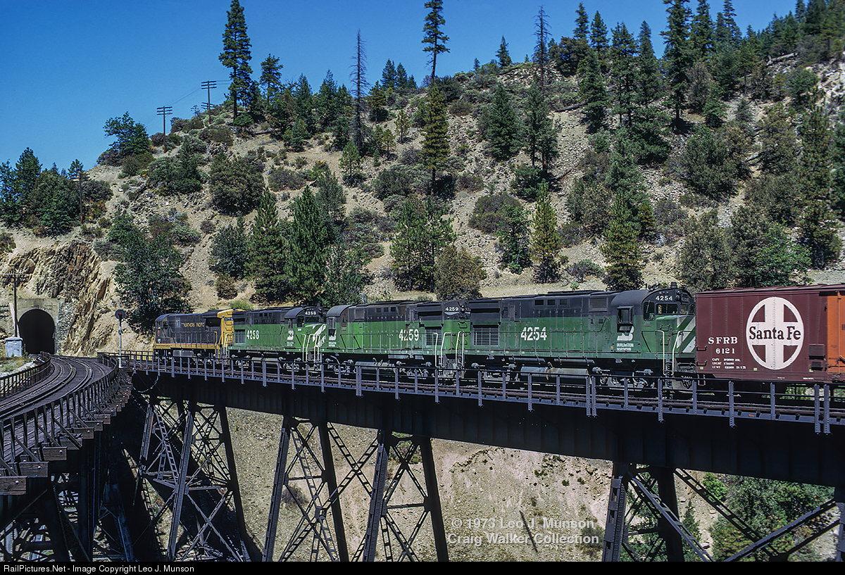Heading west on the famed Keddie Wye is a Western Pacific freight train pulled by a solid set of Burlington Northern diesels: BN U33C 5719 (ex-Northern Pacific 3304) and three BN C425s (4258 [ex-Spokane Portland & Seattle 320], 4259 [ex-SP&S 321] and 4254 [ex-SP&S 314]. BN pool power was common on the WP at this time, particularly on trains such as this one coming off the Inside Gateway, where the WP interchanged with the BN at Bieber CA. Keddie is where the WP’s original mainline from California to Utah connected to the later Inside Gateway and a connection with the Great Northern (and, later, Burlington Northern). The junction is interesting, as two of the wye’s legs are on trestles, as seen here, and the third leg is in a tunnel. This freight will soon enter Tunnel 31. (Keddie, California – September 2, 1973) Leo J. Munson Photograph, Craig Walker Collection