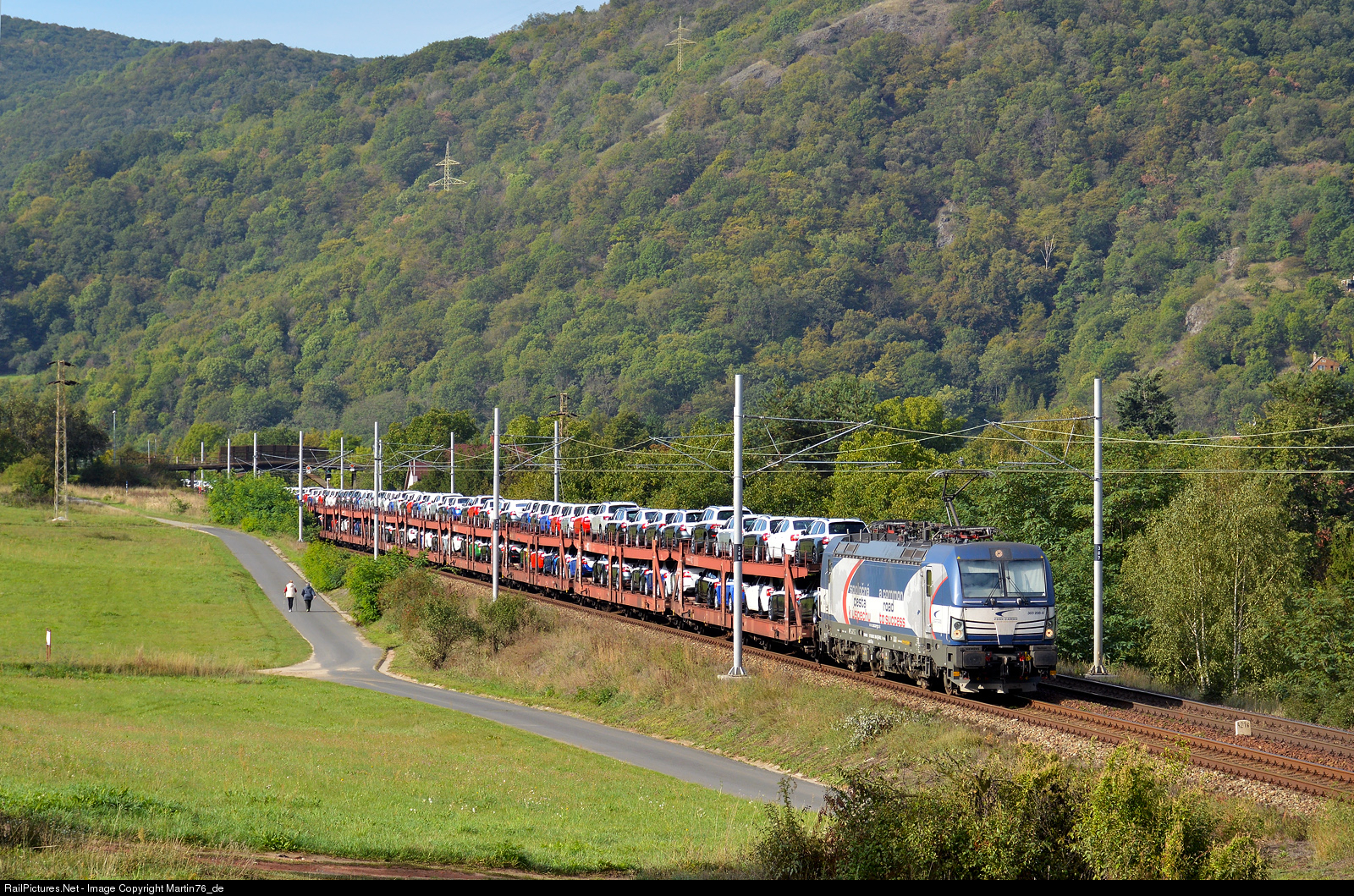 The Slovak Vectron 383.208-6 hauling a freight train loaded with cars approaching to Sebuzín.