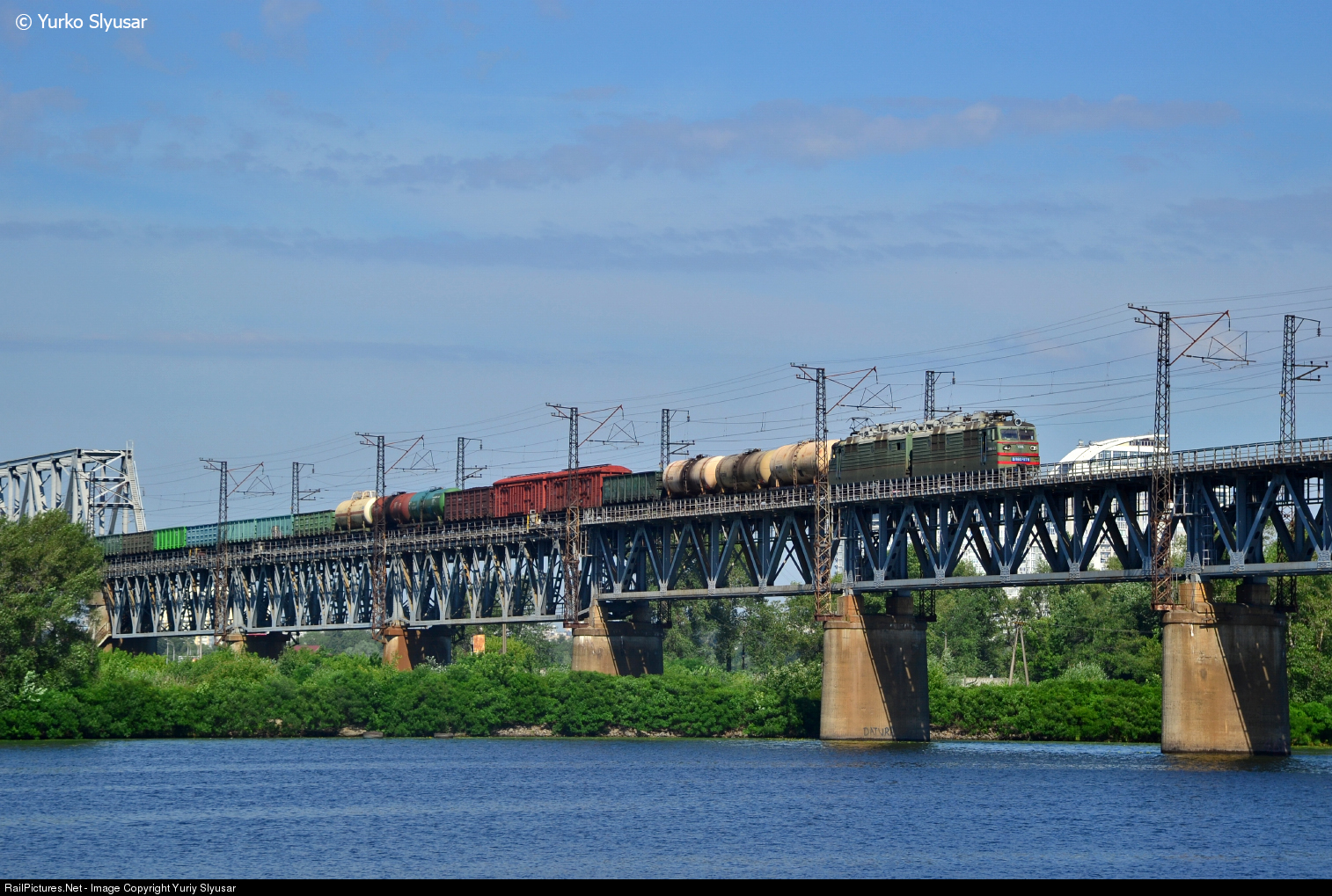The freight train passes a bridge over Desenka river from right to left bank of Kyiv