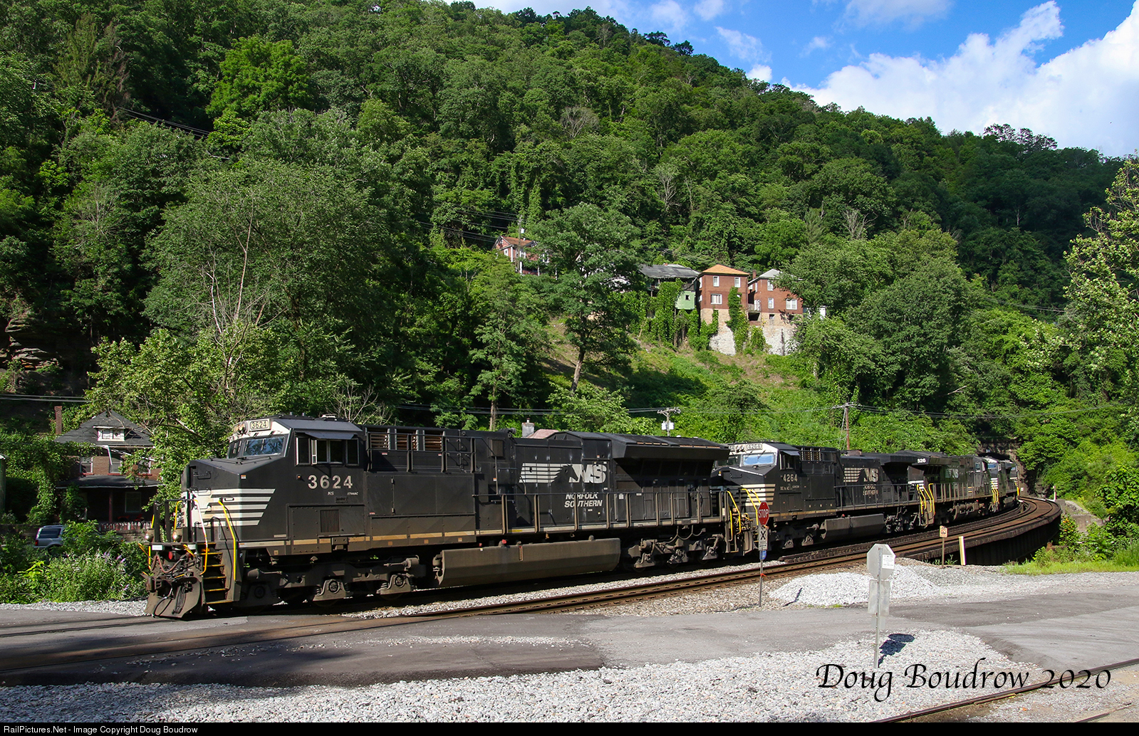 | NS empty coal train 823 is seen emerging from Welch Tunnel and crossing over the Tug Fork in Welch, WV on the former Norfolk & Western Pocahontas Division. |