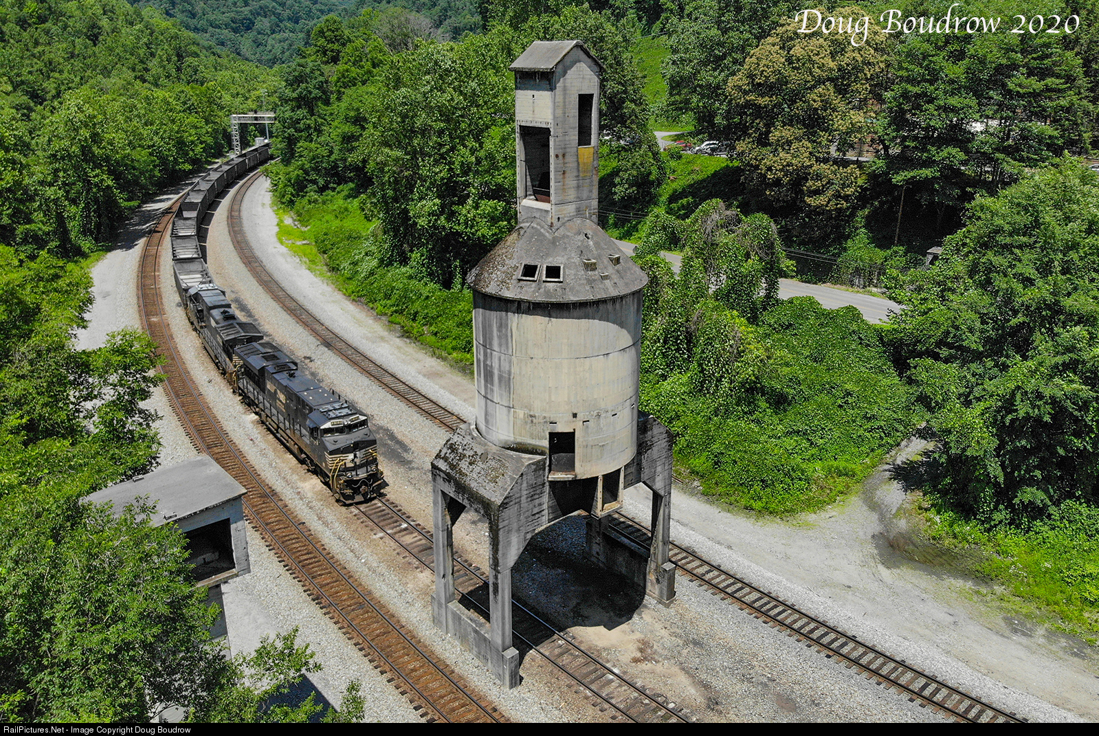 | The cement coaling tower at CP Farm is an iconic location on the former Norfolk & Western Pocahontas Division. The tower is a holdover from the days when Y and A-class steam locomotives dominated this territory hauling black diamonds out of the heart of Appalachia. CP Farm is also where pusher sets are often added to heavy coal trains going over Elkhorn Grade. |