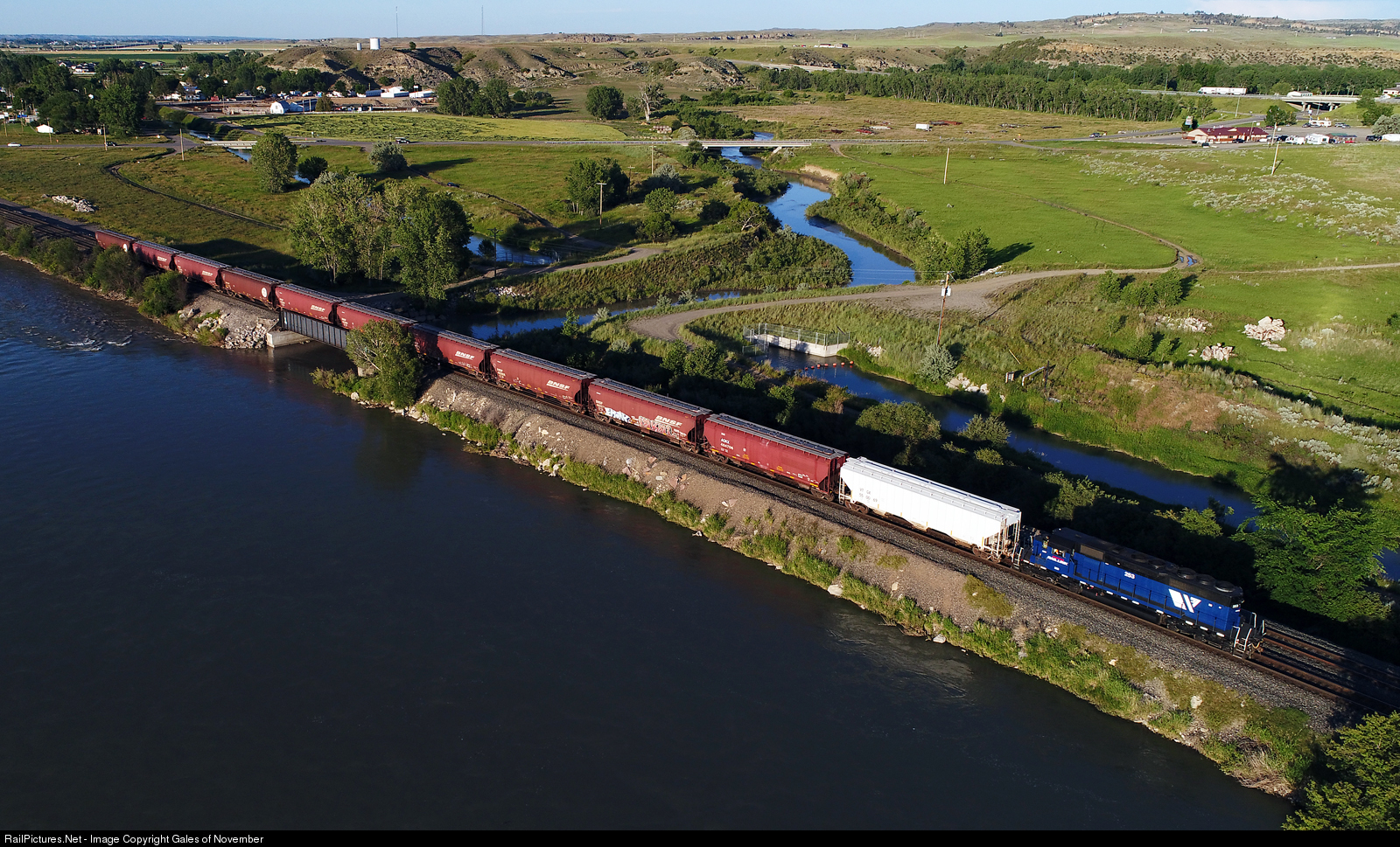 Skirting along the banks of the Yellowstone River, this switch job has just returned from the furthest point east MRL crews operate trains, the Coors elevator in Huntley, MT. Seen returning to Billings passing over the mouth to Pryor Creek with a healthy train.