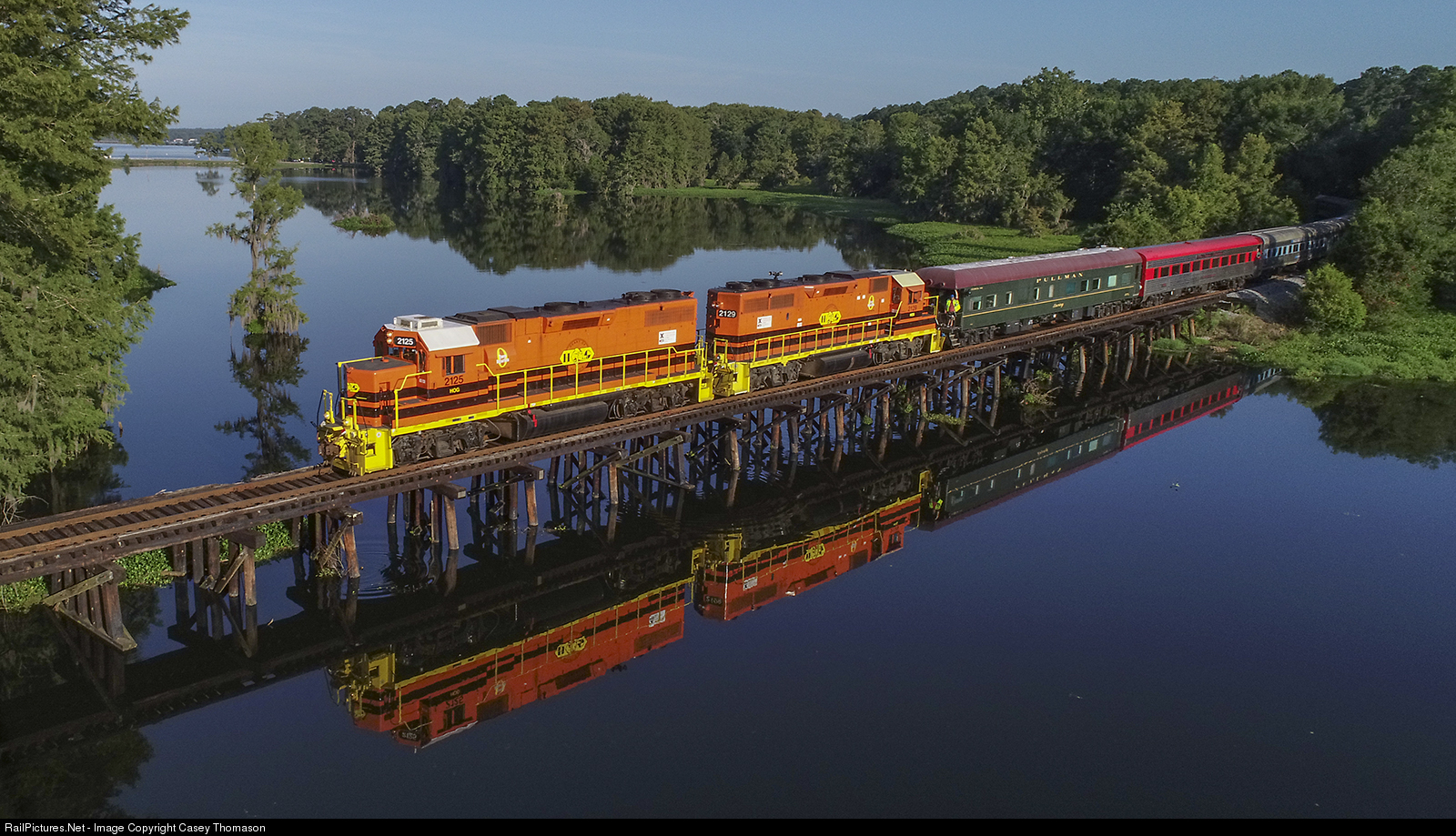| SAM Shortline's "Plains Express" excursion train crosses Gum Creek where it feeds into Lake Blackshear at Georgia Veterans Memorial State Park near Cordele, GA. |