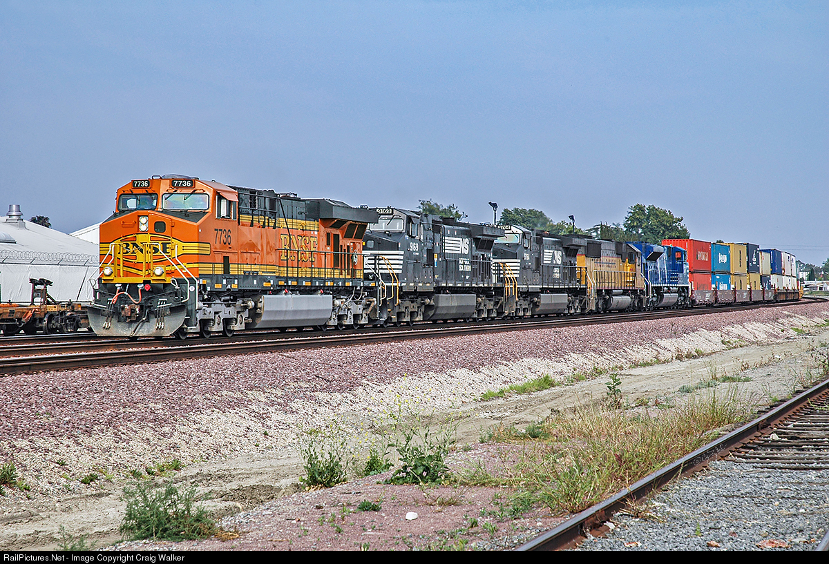 BNSF Railway train Q-STPLAC1-07 sits on Track 2 at Basta as it waits for the afternoon "Passenger Parade," in which the dispatchers give priority to the many Amtrak and Metrolink passenger and commuter trains on Tracks 1 and 3 during the afternoon rush. BNSF ES44DC 7736 leads a colorful consist this day, which includes Norfolk Southern Dash 9-40CWs 9169 and 9764, NREX SD50 5071 and CITX SD70M-2 142. This Guaranteed Service Intermodal train originated in St. Paul MN, and only has about 20 miles to go – but sometimes the last 20 miles are the longest. (Fullerton, California – May 12, 2006)