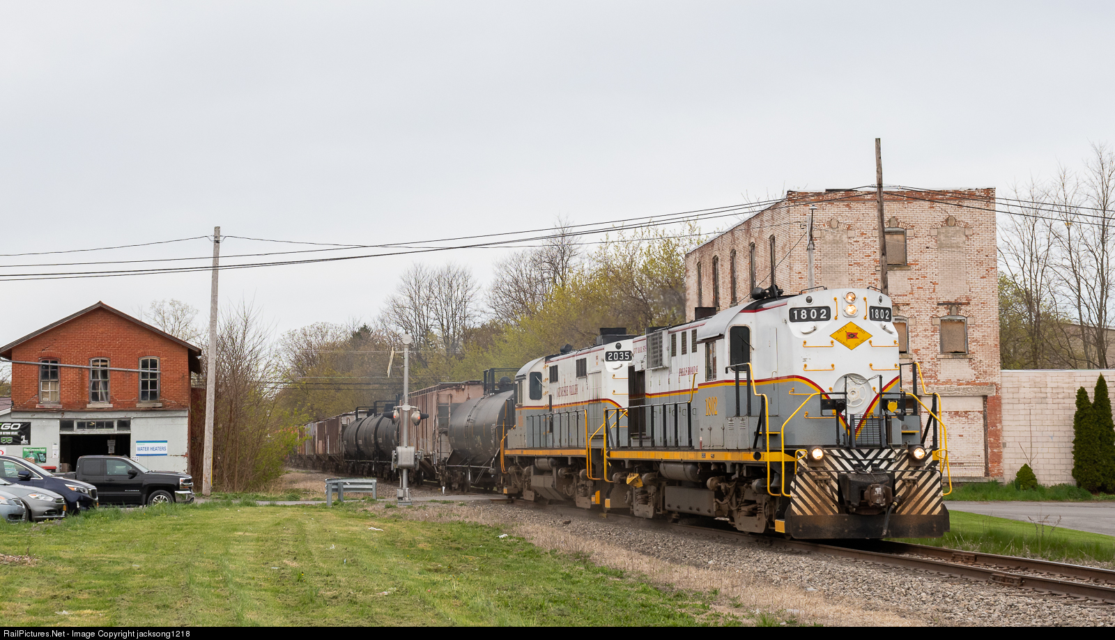 With ALCo RS-11 number 1802 in the lead, the Falls Road train rumbles through Gasport, NY on its run East with a lengthly train in tow which required both locomotives.