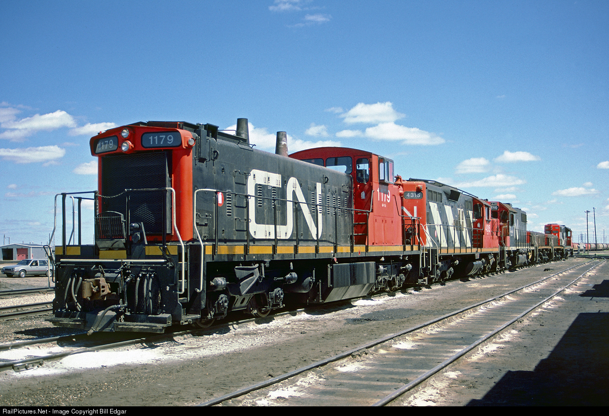 | CN 1179 is a B-B truck version of the GMD1 series owned by CN and Northern Alberta Railways. This light duty unit is couple to a light weight GP9 and a hump switching set consisting of two GP38s and a pair of switching slugs. The line up is at Symington Yards diesel shop area in greater Winnipeg, MB. |