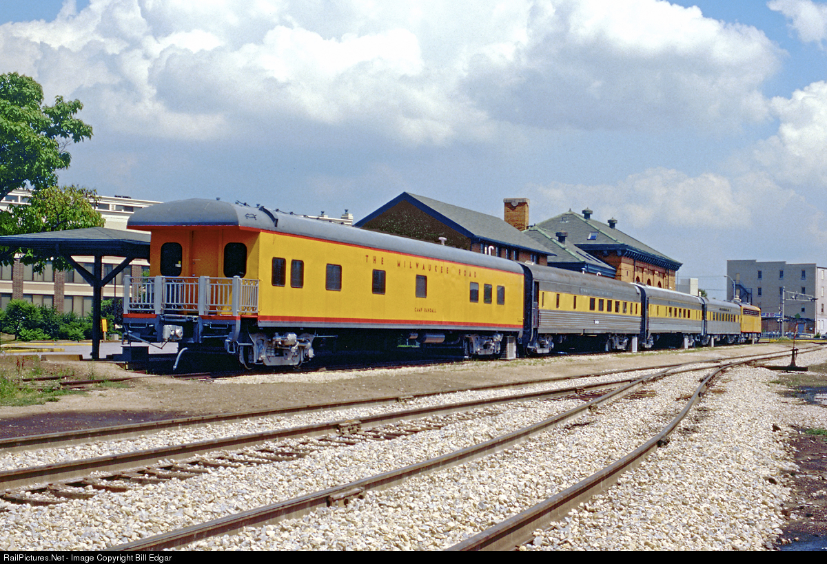 This passenger train was assembled and put on idsplay next to the former Milwaukee Road station in Madison, WI. In 1995 it was nicely intact, fresh paint and appeared ready to leave for Chicago. In 2019 the equipment is still there, behind a chain link fence, pulled apart, and in need of TLC. The Camp Randall is a former SP business car. The other cars and locomotive came from Penn Central and its predecessors.