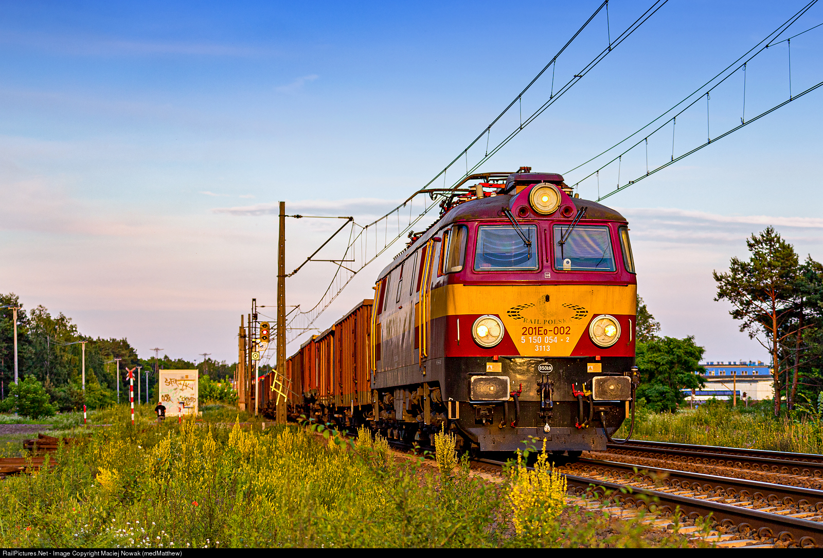 | Northbound freight train full of coal being hauled by electric locomotive 201Eo-002 (ET22 series) during impending sunset. |
