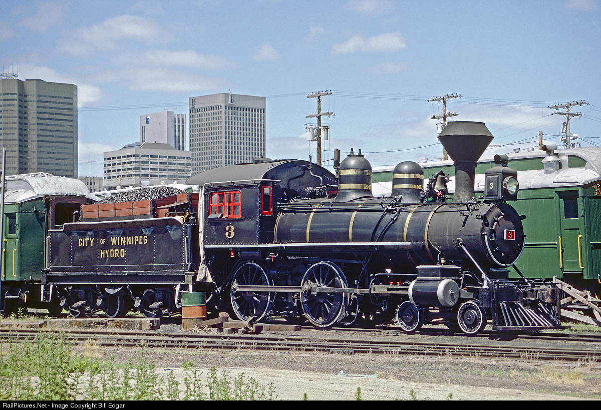 | Winnipeg Hydro Railway no. 3 sits in Winnipeg, MB. Winnipeg Hydro became Manitoba Hydro in 2002. The loco was built as CPR 22 in 1882 and acquired by Winnipeg Hydro in November 1918. 100 years later is continues to run excursions on the Prairie Dog Central based out of Inkster, MB. |