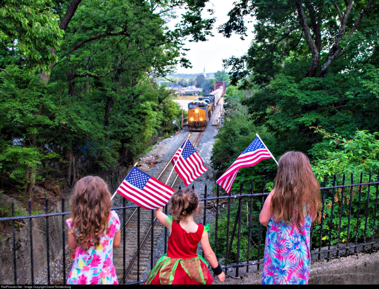 July 5, 2020: As the three day Independence Day Weekend winds down, our three daughters greet the crew of westbound CSX Q360 from the overpass at D Street in Hamilton with waves and waving flags.