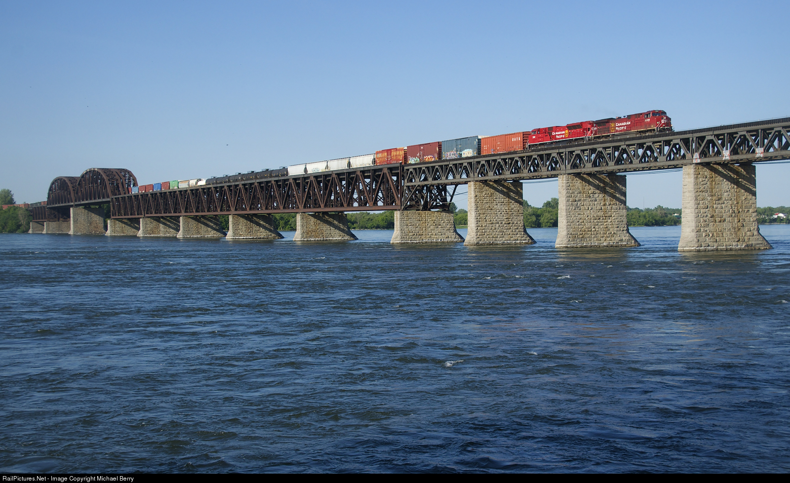 Rebuilds CP 8055 & CP 7031 lead CP 253 over the St. Lawrence River on the west track of CP's Adirondack Sub.