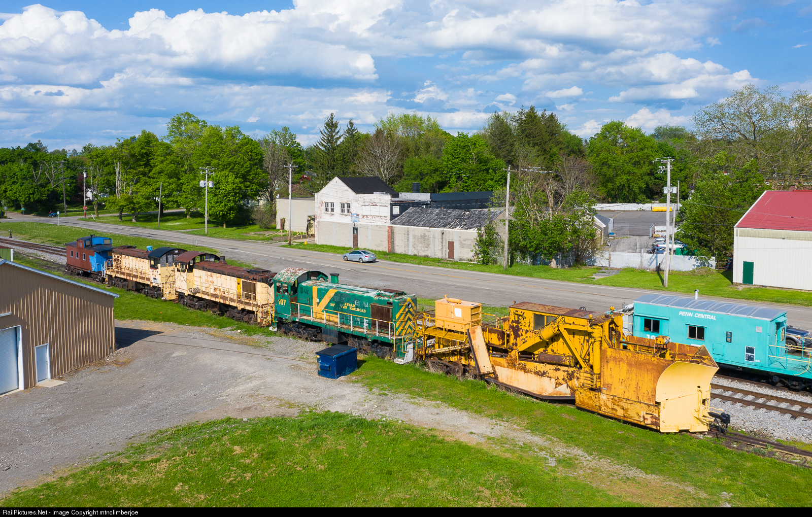 An eclectic mix of rail equipment sits on a siding track in Hamburg, New York along the Buffalo Southern Railroad. Pictured here is a former Conrail jordan spreader, Buffalo Southern Alco S2, a pair of former South Buffalo Railway Alco S2's and an unknown caboose. A restored Penn Central caboose can also be seen on an adjacent track of the Buffalo Cattaraugus & Jamestown Scenic Railway.