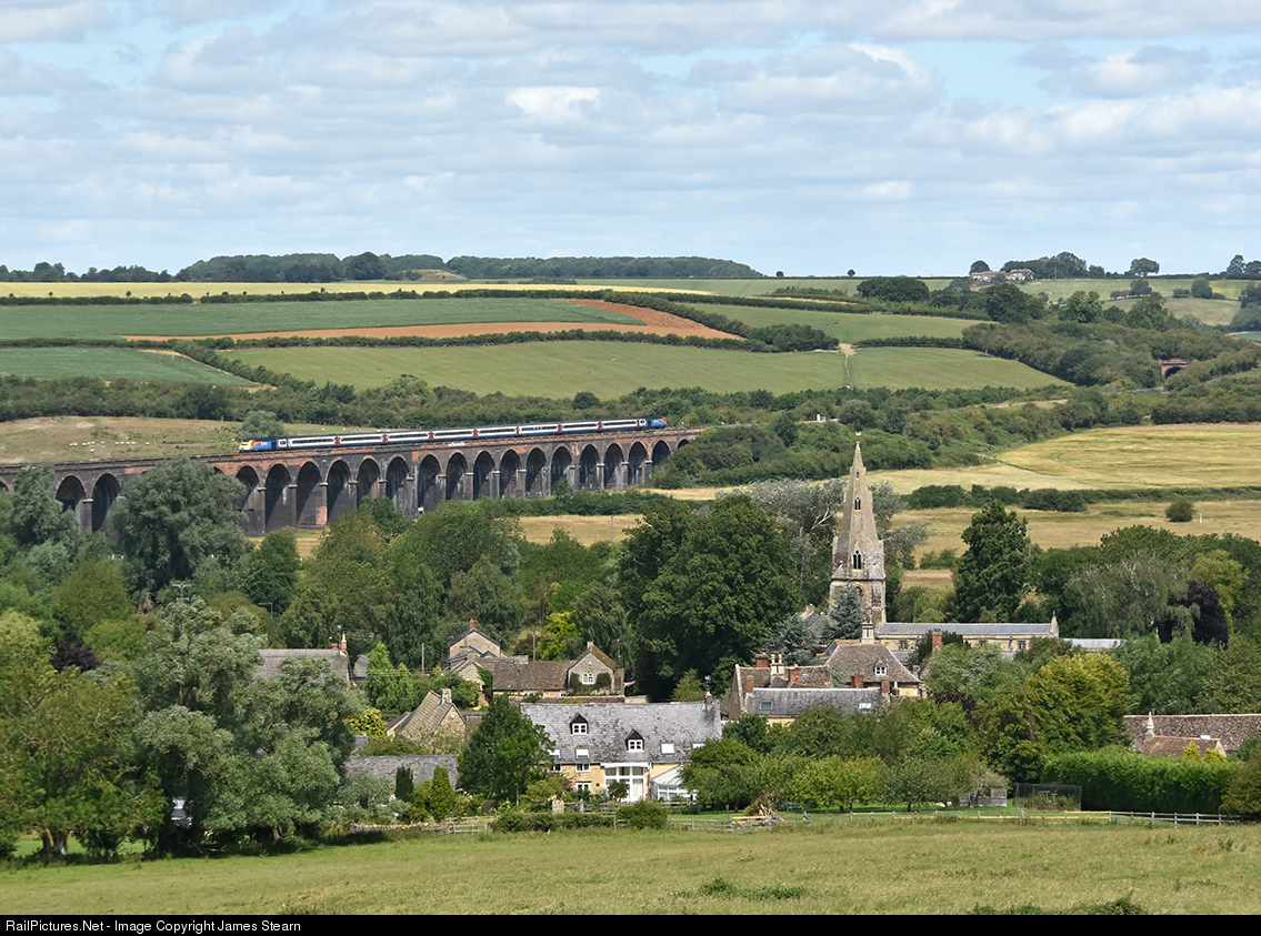 | The stunning 82 arch and Grade II listed Harringworth Viaduct crosses the Welland Valley on the boundary of Northamptonshire and Rutland. The line has just one booked passenger service each day and is otherwise a freight only backwater. Occasionally however the route comes alive as a diversion to the Midland Mainline between Kettering and Loughbrough. On one such occasion a London St Pancras - Nottingham HST with the outgoing VP185 engined powercars 43048 and 43049 is pictured on the viaduct, the village of Harringworth in the foreground. |