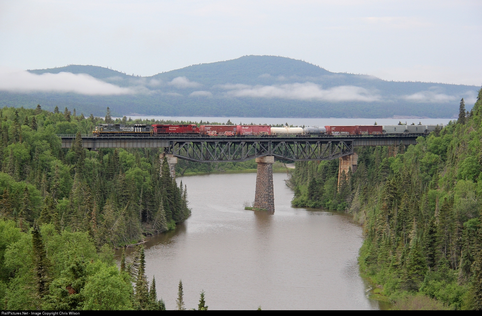 | Canadian Pacific's 75th Anniversary of D Day World War II Memorial painted locomotive 6644 proudly lead's Winnipeg, MB - Toronto Yard, ON freight 420-04 across the Little Pic River. Coastal Fog is forming off Lake Superior on the Coldwell Peninsula behind. |