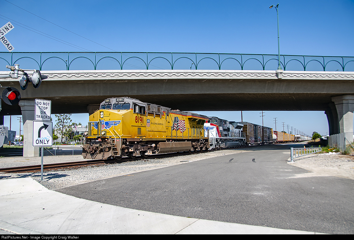 Passing the Union Pacific’s Carmenita Yard is UP train M-WCAN1-06, the Anaheim Hauler. This train departed West Colton Yard at 4:35 am and got to Carmenita at 09:57 am as it headed to Anaheim (where it would arrive at 10:45 am – just a "quick" 6 hours and 10 minutes to make the 68½-mile trip). The hostlers in West Colton put UP 1111, the railroad’s "Powered by Our People" engine, as the second unit – unfortunately. (Santa Fe Springs, California – July 6, 2020)