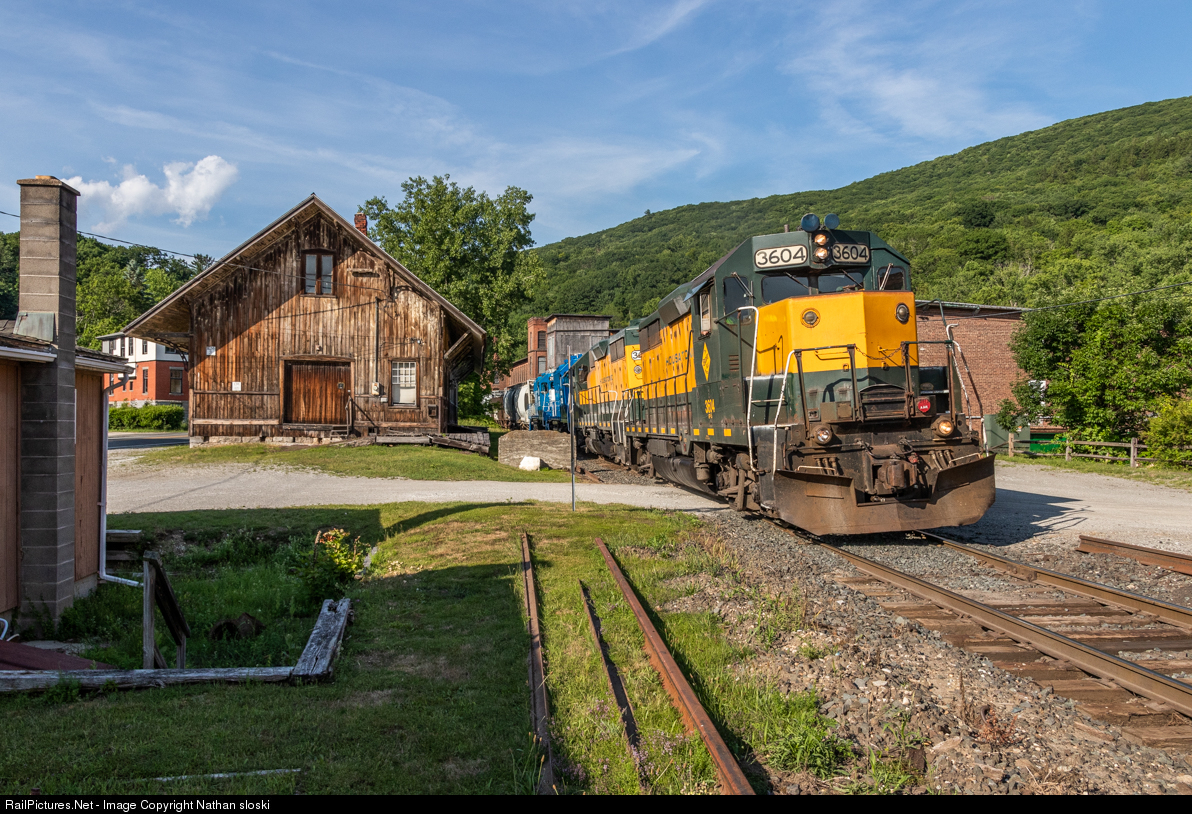 | The Housatonic, in Housatonic, on the Housatonic River. NX12 passes by the old freight house in its namesake town as it heads south with the two new Leasers in tow. |