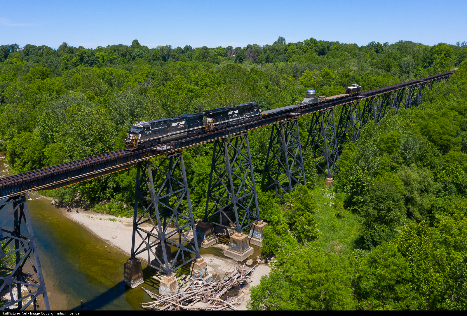 A pair of Norfolk Southern GE's lead westbound NS 056, a special move of a nuclear cask container, as it crosses over Elk Creek on a massive trestle in Girard, Pennsylvania. The move is escorted by guards traveling in the caboose on the end of the train.