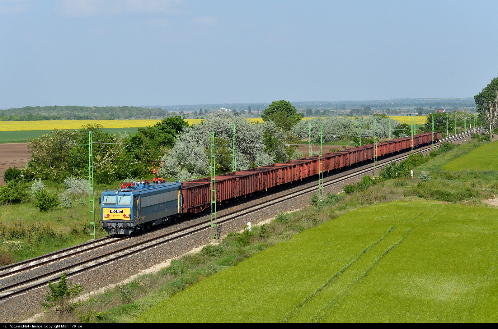 The electric locomotive 630.017 hauling a freight train approaching the station Székesfehérvár.