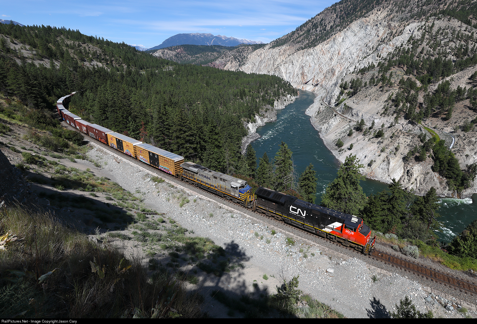 Cresting one of the many summits along CP's right of way in the Fraser and Thompson Canyons, CN 3028 crest the hill under brilliant morning sunshine. CN's RoW on the opposite side of the river is a newer better engineered line, but had to endure the worst geologic features of the Canyons. Railroads use directional traffic thru the canyon to better move the end-less parade of trains. This perch above the mainlines is one of favorite spots in Canada.