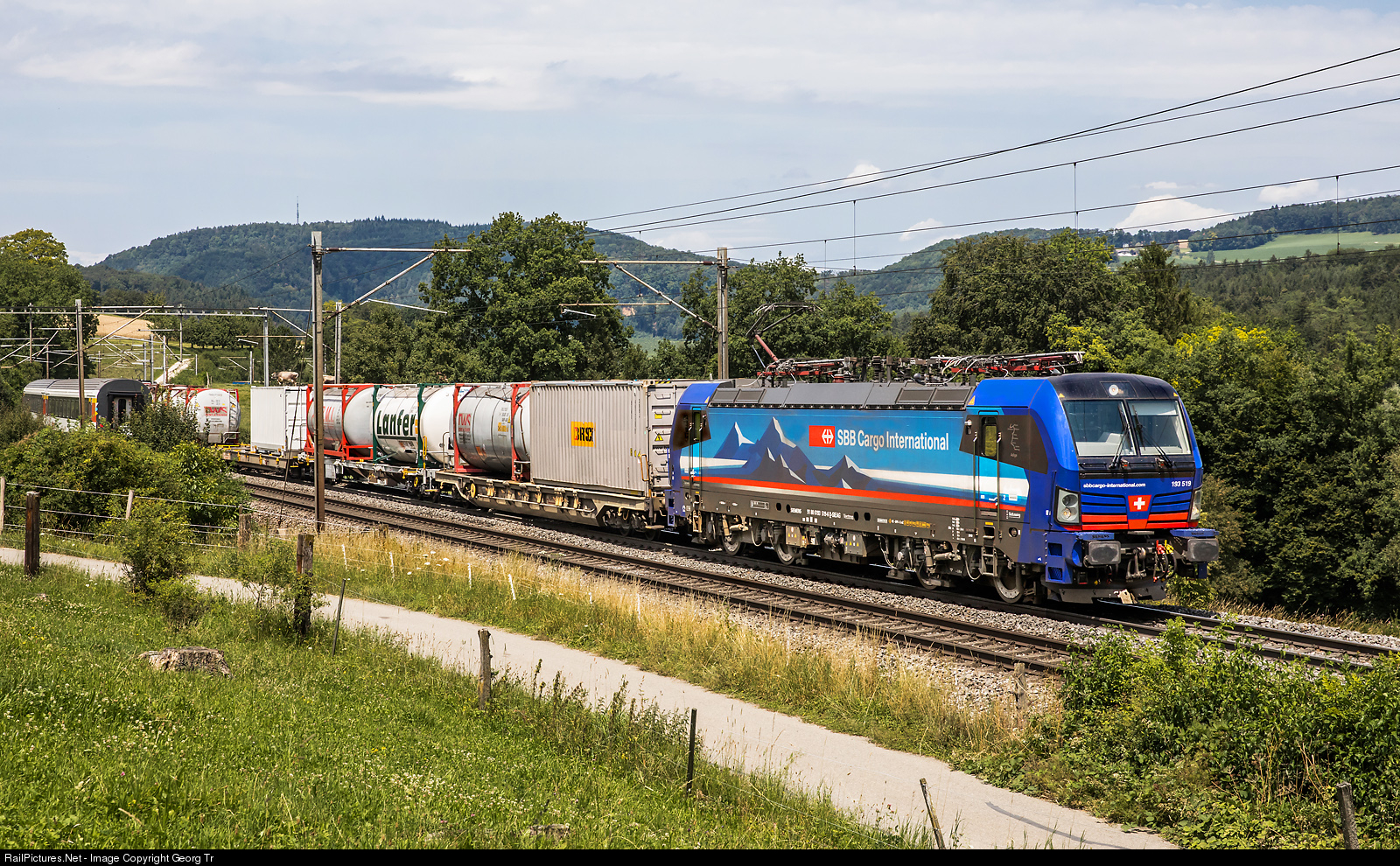 | Siemens "Vectron" 193 # 519 "Adige" of SBB Cargo International, rented from the SüdLeasing Gmbh, is pulling the southbound intermodal train 43075 from Rheinhausen Hafen/Germany to Gallarate/Italy (Busto Arsizio Terminal) on the 1.4 % grade of the Bözberg north ramp between Hornussen and Effingen. |