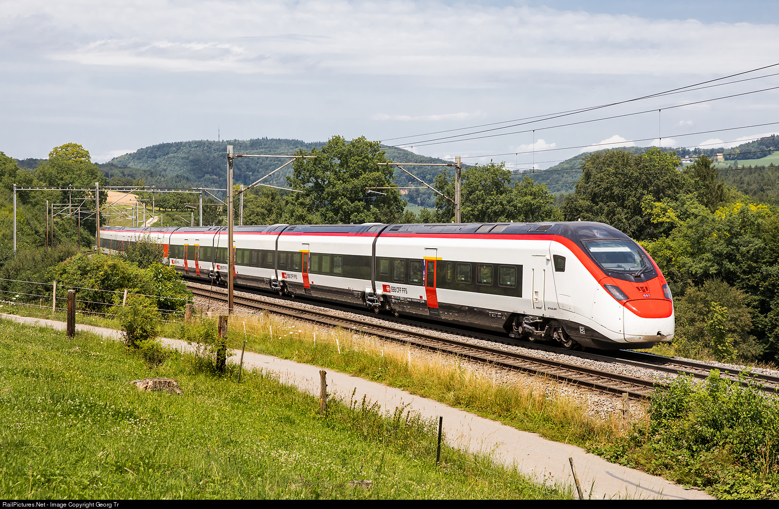 | StadlerRail "Giruno" highspeed train RABe 501 # 013 of the SBB is running as Interregio 2071 of the line IR36 from Basel via Frick-Brugg-Baden-Zürich HB to Zürich Airport on the Bözberg north ramp between Hornussen and Effingen. This hourly connection between Basel and Zürich Airport and vice versa is also called "Flugzug" (flight train). |