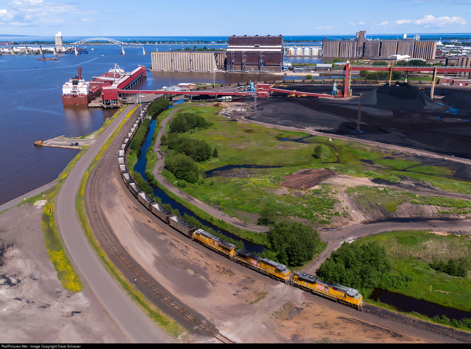 A UP train of petroleum coke from the Flint Hills Pine Bend refinery near St. Paul unloads at the Midwest Energy Resources Company dock in Superior. The longest vessel on the Great Lakes, the M/V Paul R. Tregurtha at 1,013.5 feet, loads western coal for Detroit Edison.