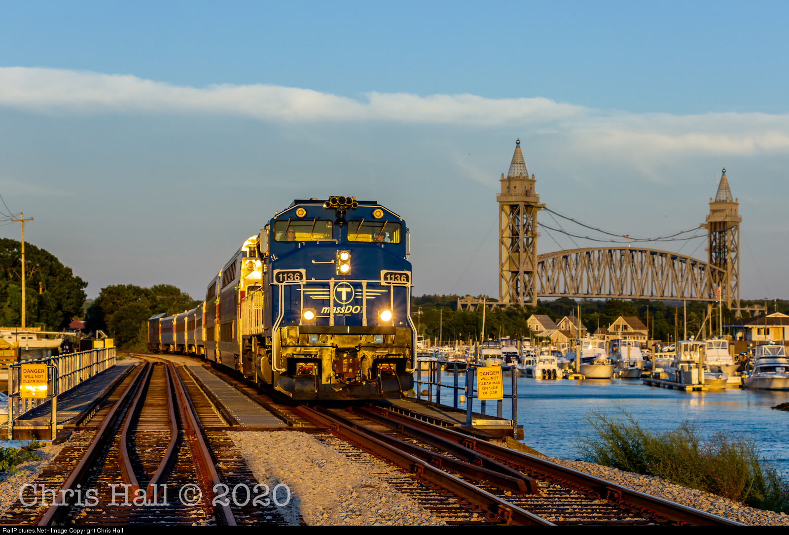 The MBTA CapeFLYER (known as the "Flying Clam" to locals) crosses over Cohasset Narrows just after crossing the Cape Cod Railroad Bridge. The new "MassDOT Blue" 1136 leads the flyer during pandemic fun times.