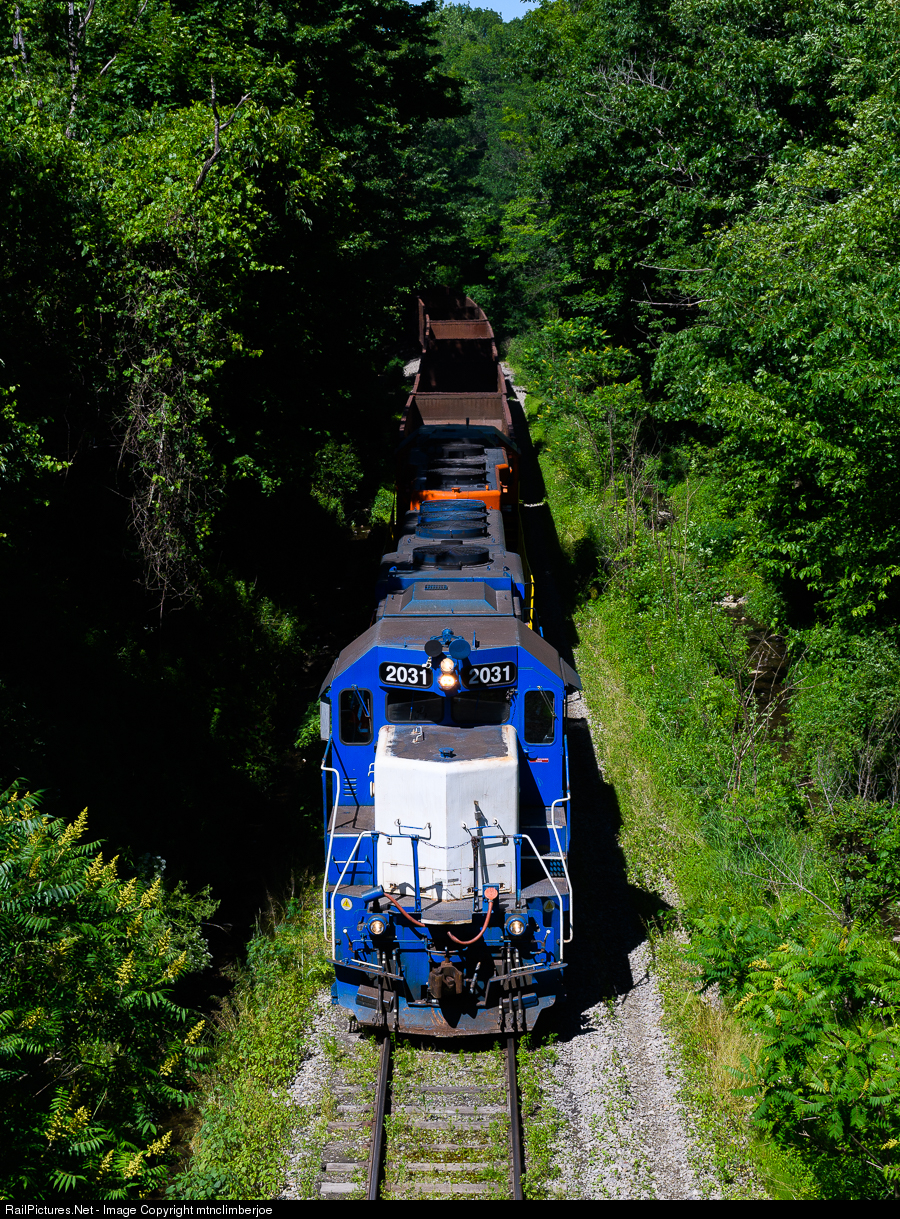 | The Buffalo & Pittsburgh's WAER swings around the bend as it climbs out of Erie and begins its return trip to Warren as it passes under Shannon Road. On the point is BPRR 2031, a former GMTX lease GP38-2. |