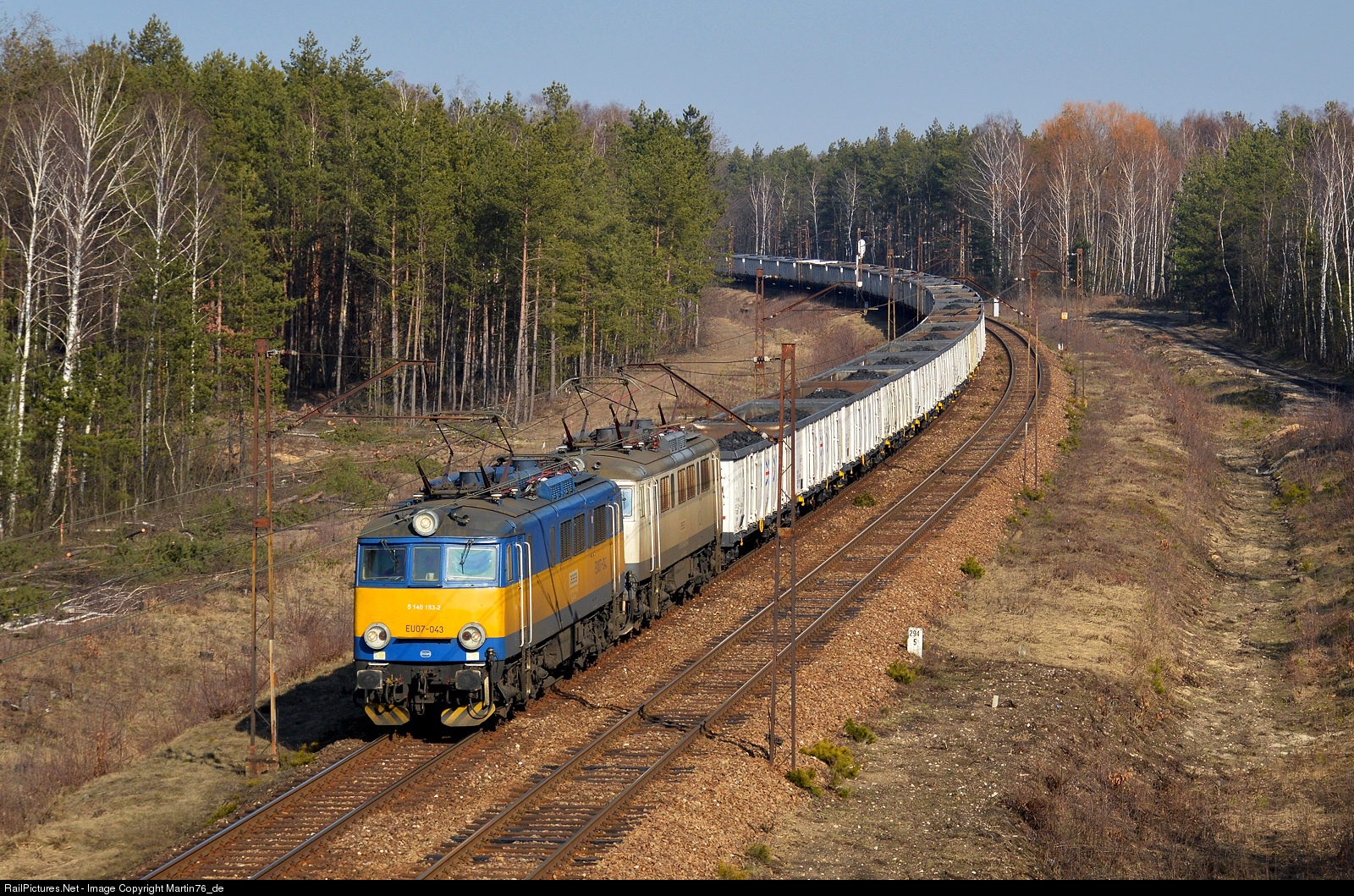 Two electric locomotives EU07-043 and EU07-167 hauling a freight train.
