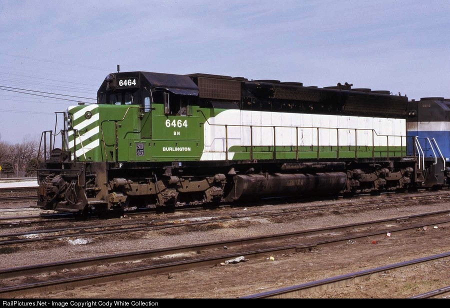 | Burlington Northern SD45 6464 leads an EX GN F45 at Minneapolis MN August 1970. The 6464 was built in January 1969 as CB&Q 523 and is wearing the "Proposed" Burlington Northern merger scheme. The intent with this scheme was to add the word "Northern" under the "Burlington" when merger approval was granted but this became just another pre merger scheme to paint over. The white Hockey Stick stripe was retained for some passenger units on the BN. Unknown Photographer Photo from my Collection. |