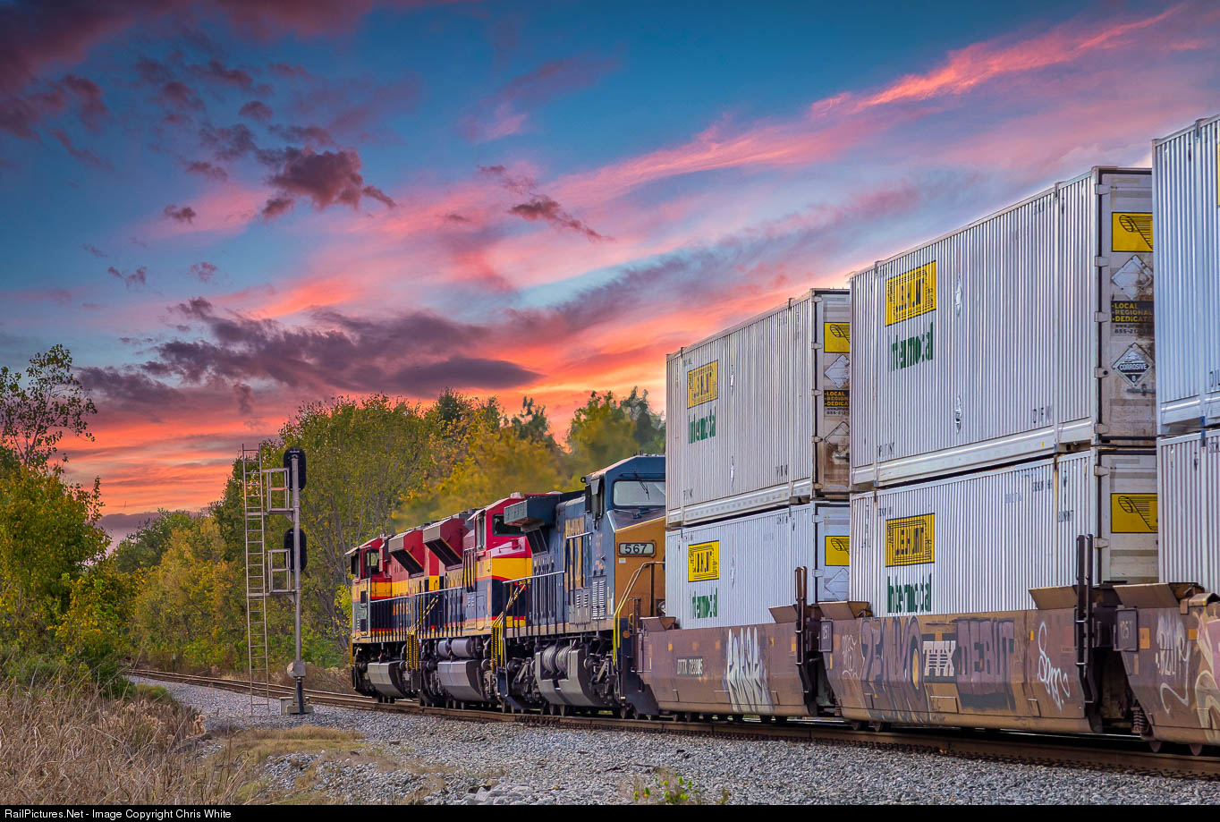 KCS 4125 along with another KCS Southern Belle and a CSX GE lead the daily I-ATDA/NS 219 down the main at West Brandon under a stunning Mississippi sunset.