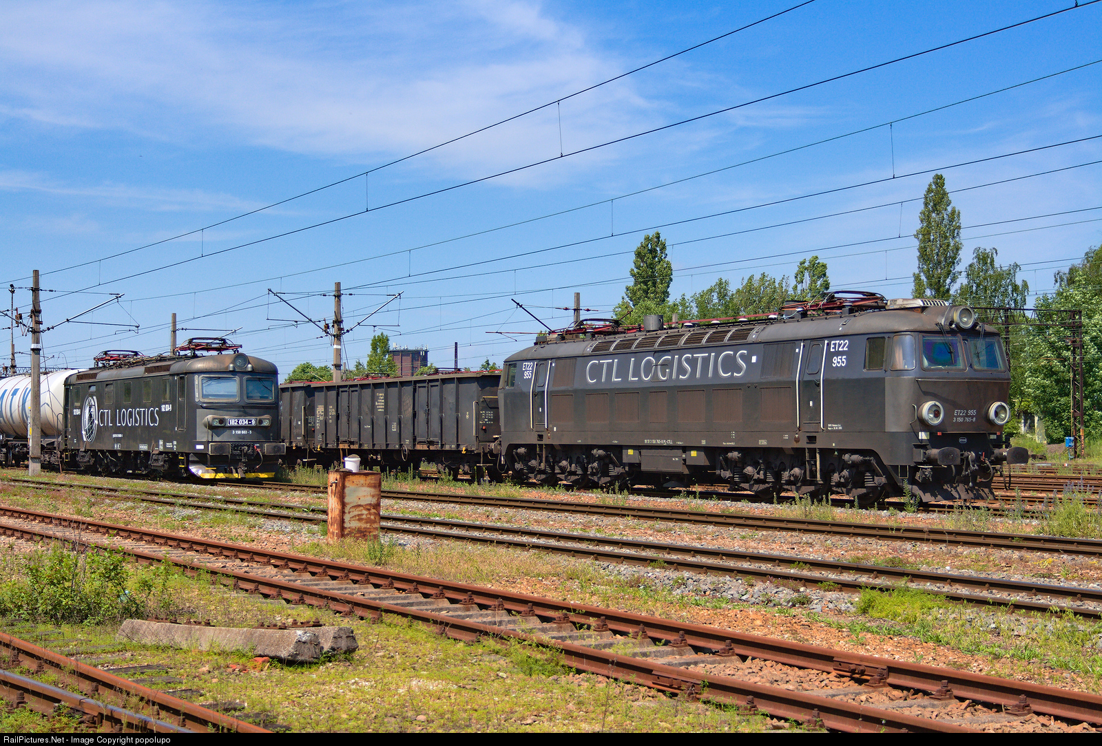 | ET22-955 (Pafawag 201E, 1985) with gondolas and 182 034 (Skoda 59E, 1963) with tank cars waiting for departure signal at Lodz Olechow yard. |