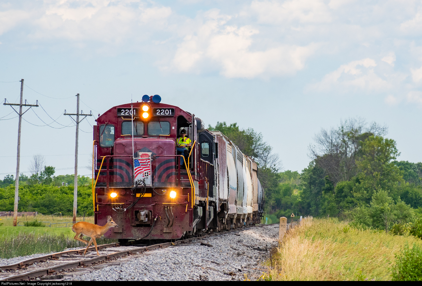 | Finger Lakes Railway train GC-2 works its way through the countryside of on its way to Canandaigua, NY at milepost "S 72" on the ex New York Central Auburn Road. Just before the train starts blowing for the Hanna Road crossing, a deer leaps in front of GE U23B number 2201 making it across the tracks just in time. |